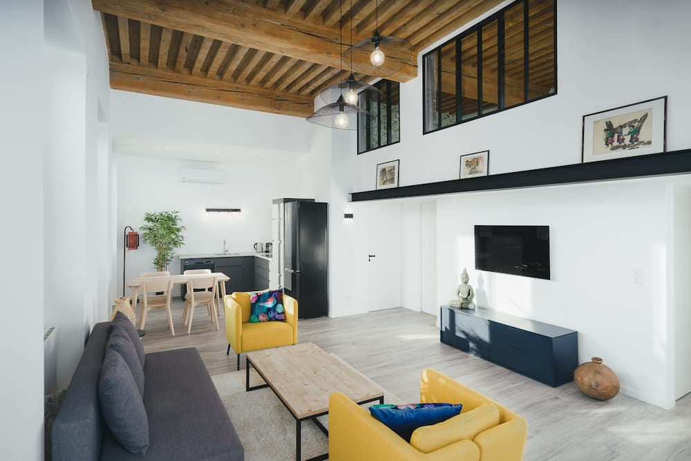 La rénovation de ce canut a été réalisée en intégrant une mezzanine pour maximiser l'utilisation de l'espace vertical. Les caractéristiques historiques, telles que les poutres apparentes et les hauts plafonds, ont été préservées pour conserver le charme d'origine. La mezzanine, ajoutée avec subtilité, offre une nouvelle zone fonctionnelle, pour créer deux nouvelles chambres, tout en maintenant une esthétique cohérente avec le style canut.